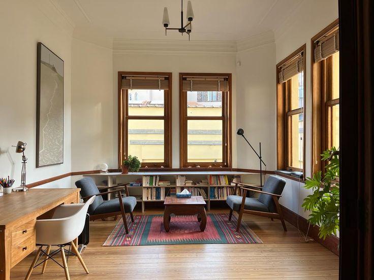Le bureau est un espace très agréable, accueillant et calme, situé à l'arrière de l'immeuble. Exposé sud/est avec 4 grandes fenêtres, il est ensoleillé et meublé avec simplicité et élégance. Le décor art-nouveau d'origine lui donne une touche unique.